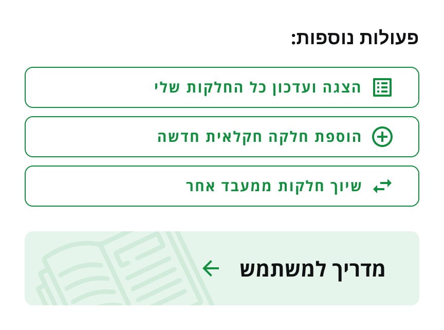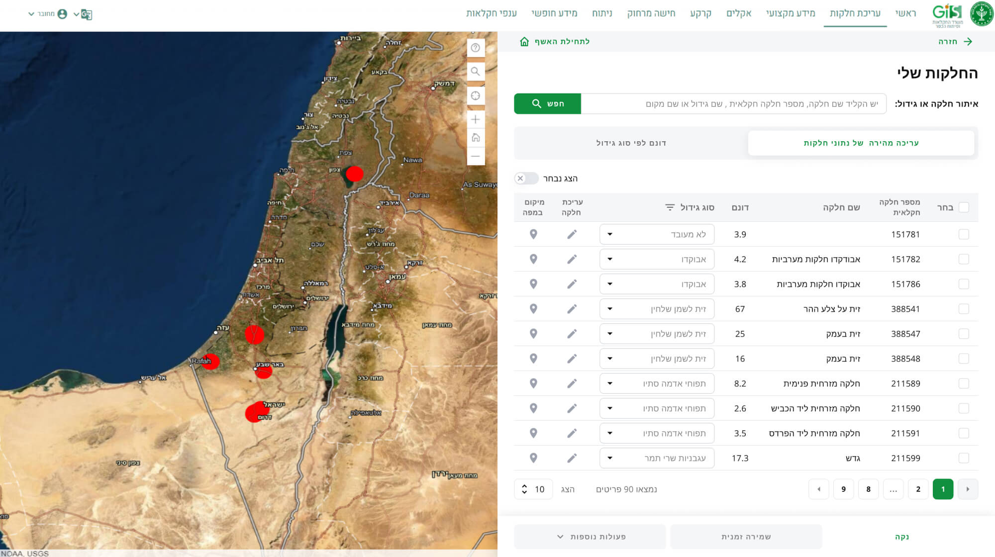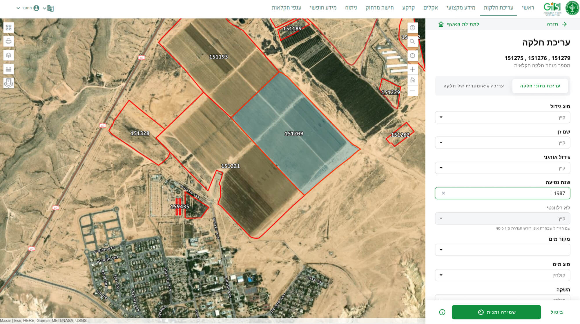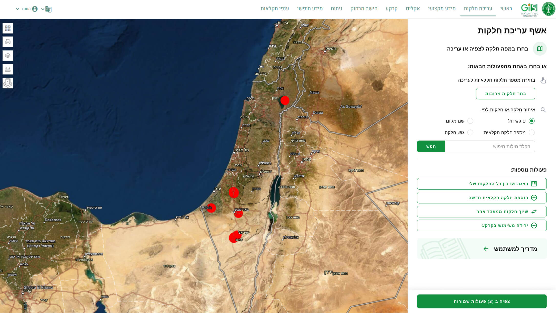 מאפשרת לחקלאי לערוך אונליין את המידע על החלקות שלו. אשף עריכת חלקות המאפשר לחקלאי לעדכן נתונים של חלקה, להוסיף, למחוק, לאחד, לפצל, לשנות צורות חלקה, לעדכן נתונים על מספר חלקות בו זמנית ועוד