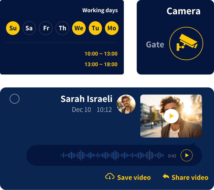 מערכת אינטרקום לבתים משותפים ופרטיים המחוברת לטלפון הנייד של הדייר. מערכת האינטרקום מותקנת: בכניסה לבניין, בדירת הדייר, במעלית, בחברות, בשער חשמלי ופותחת שערים באופן אוטומטי ללא צורך במפתח.